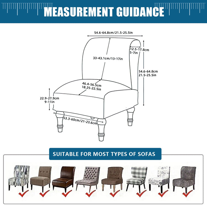 🌸Perfect Size: Our chair covers suitable for most armless accent chairs. Back length: 33-43.1cm/13-17 inch,back height(above seat): 54.6-64.8cm/21.5-25.5inch,back thickness: 10-17.8cm/4-7 inch,seat length: 53.3-60cm/21.0-23.6inch,seat width: 46.4-56.5cm/18-22 inch,seat thickness: 16.5-28cm/6.5-11inch. Please measure your armless chair in advance and compare it to our size chart.